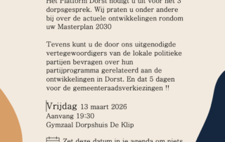 Terugkoppeling inloopbijeenkomst ‘Tijdelijke bouwweg Dorst-Oost en woningbouwontwikkeling Dorst Zuidoost’ Op 25 juni 2025 heeft in dorpshuis De Klip een inloopbijeenkomst plaatsgevonden over de plannen aan de oostkant van Sint Jorisveld te Dorst. De bijeenkomst werd georganiseerd door de gemeente Oosterhout. Ook was er een vertegenwoordiging van projectontwikkelaar Van Wanrooij aanwezig. Opzet avond Tijdens [...]