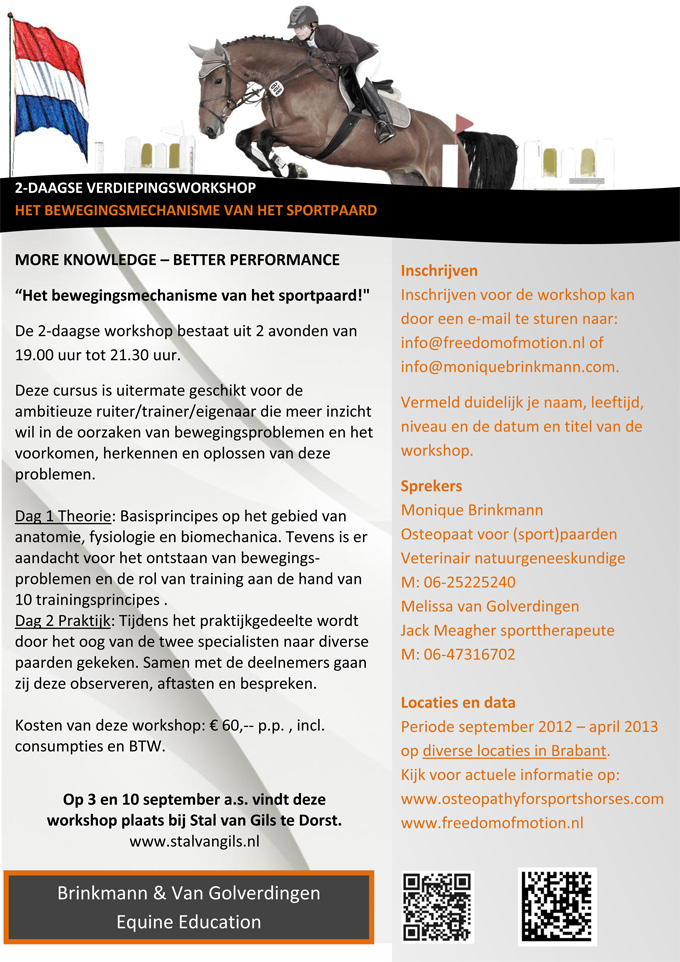 In de periode september tot en met april reizen de dames heel Brabant door met deze workshop. De eerste start op 3 september bij Stal Van Gils te Dorst. Vervolgdata en locaties zijn te vinden op hun beide websites: www.osteopathyforsportshorses.com/ www.freedomofmotion.nl. Hier kunt u ook terecht voor aanmeldingen.