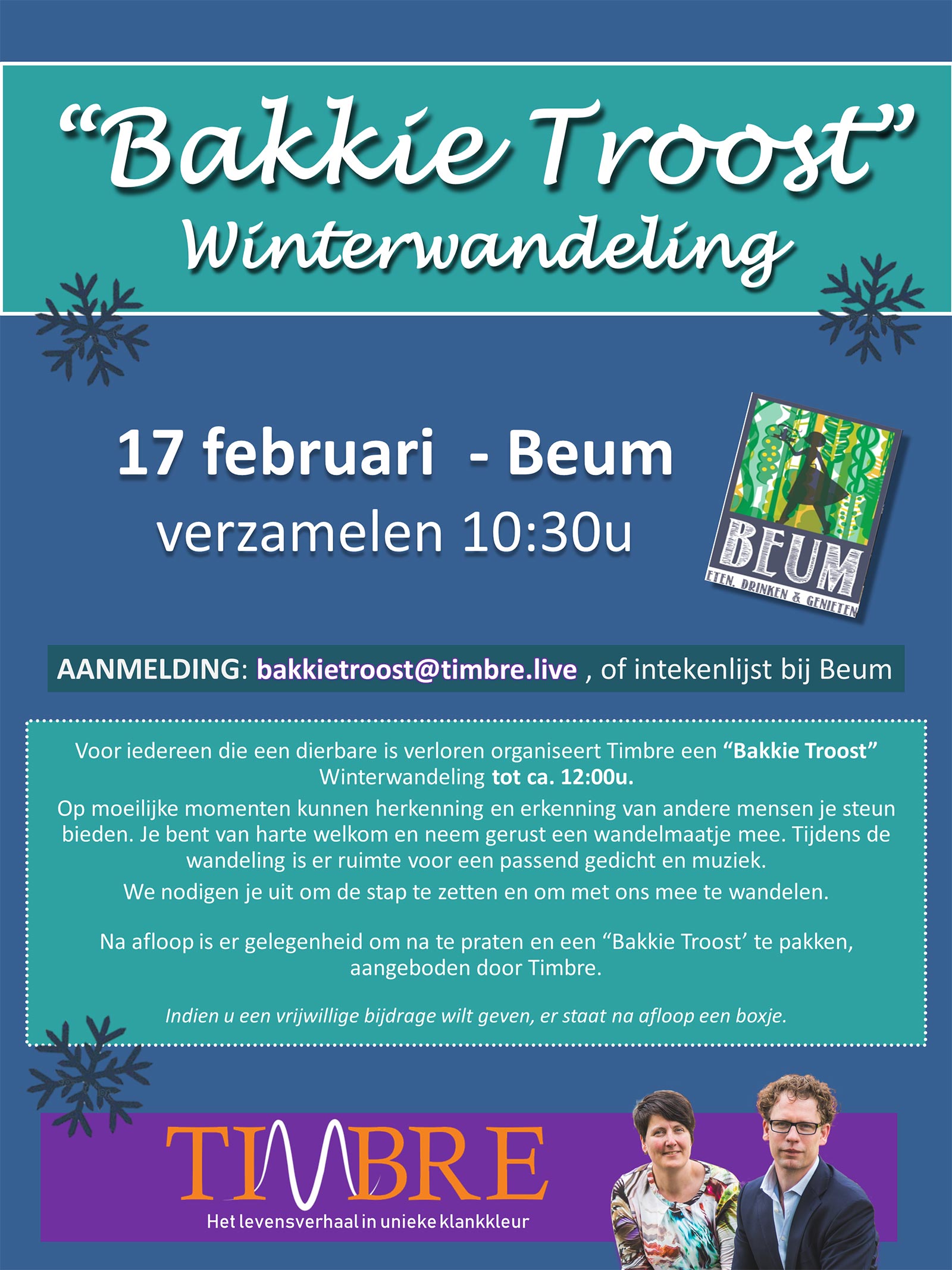 Zondag 17 februari organiseert Timbre (www.timbre.live) een ‘Bakkie Troost’ Winterwandeling voor iedereen die een dierbare verloren heeft. Op moeilijke momenten kunnen herkenning en erkenning van andere mensen je steun bieden. Je bent van harte welkom om mee te lopen en neem gerust een wandelmaatje mee.